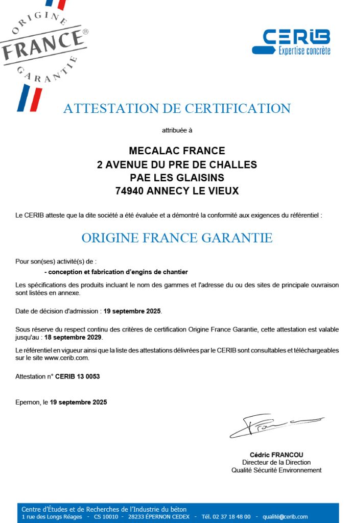 Attestation de conformité – Certificat attribué à MECALAC FRANCE pour son activité de :
