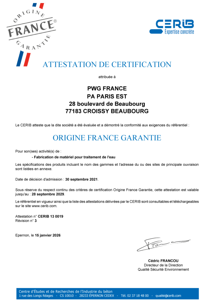 Attestation de conformité – Certificat attribué à PWG France pour son activité de fabrication des produits suivants :
