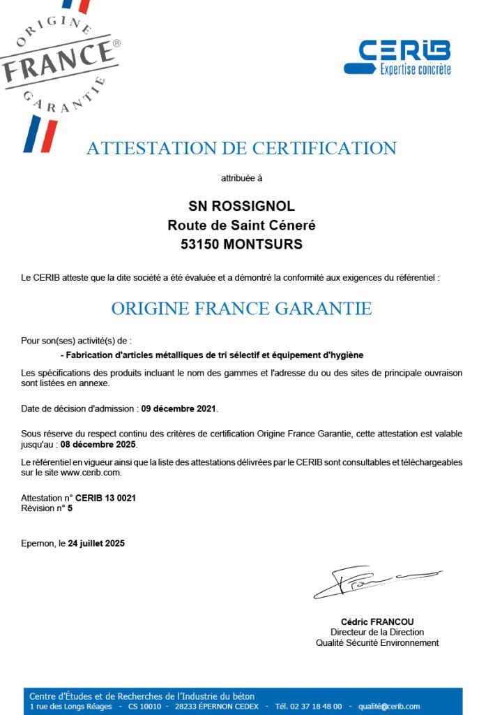 Attestation de conformité – Certificat attribué à SN ROSSIGNOL pour son activité de :