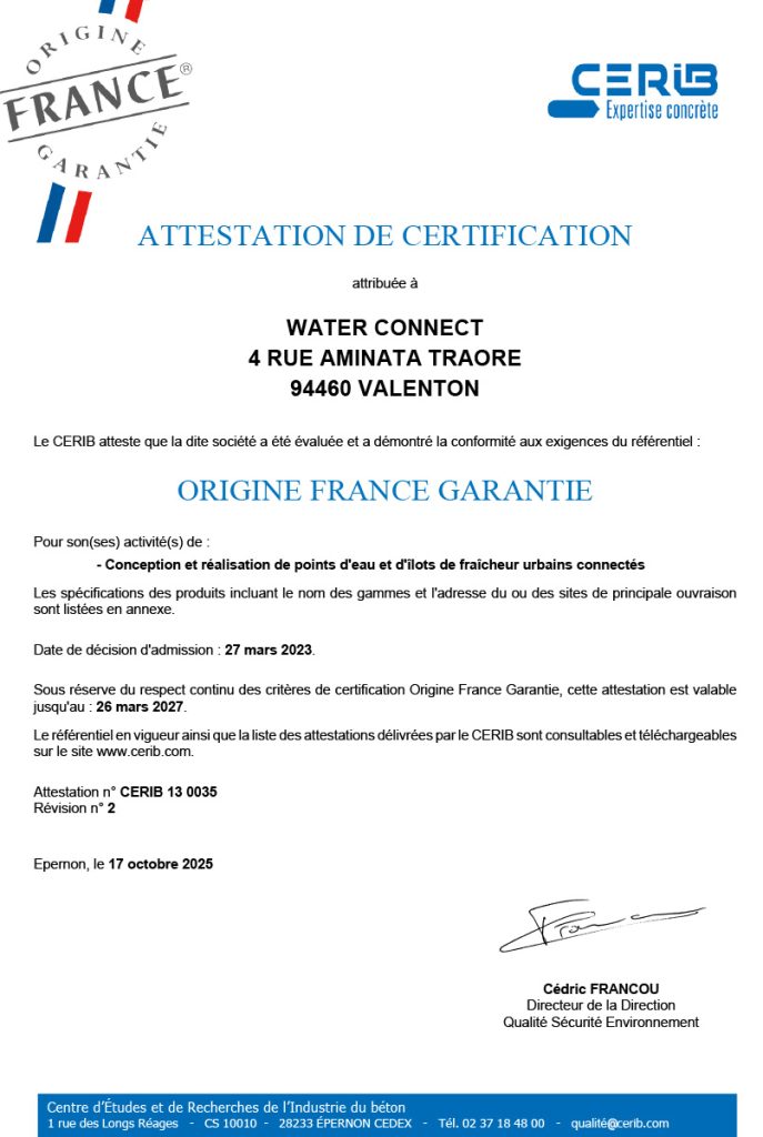 Attestation de conformité Origine France Garantie – Certificat attribué à WATER CONNECT pour son activité de :