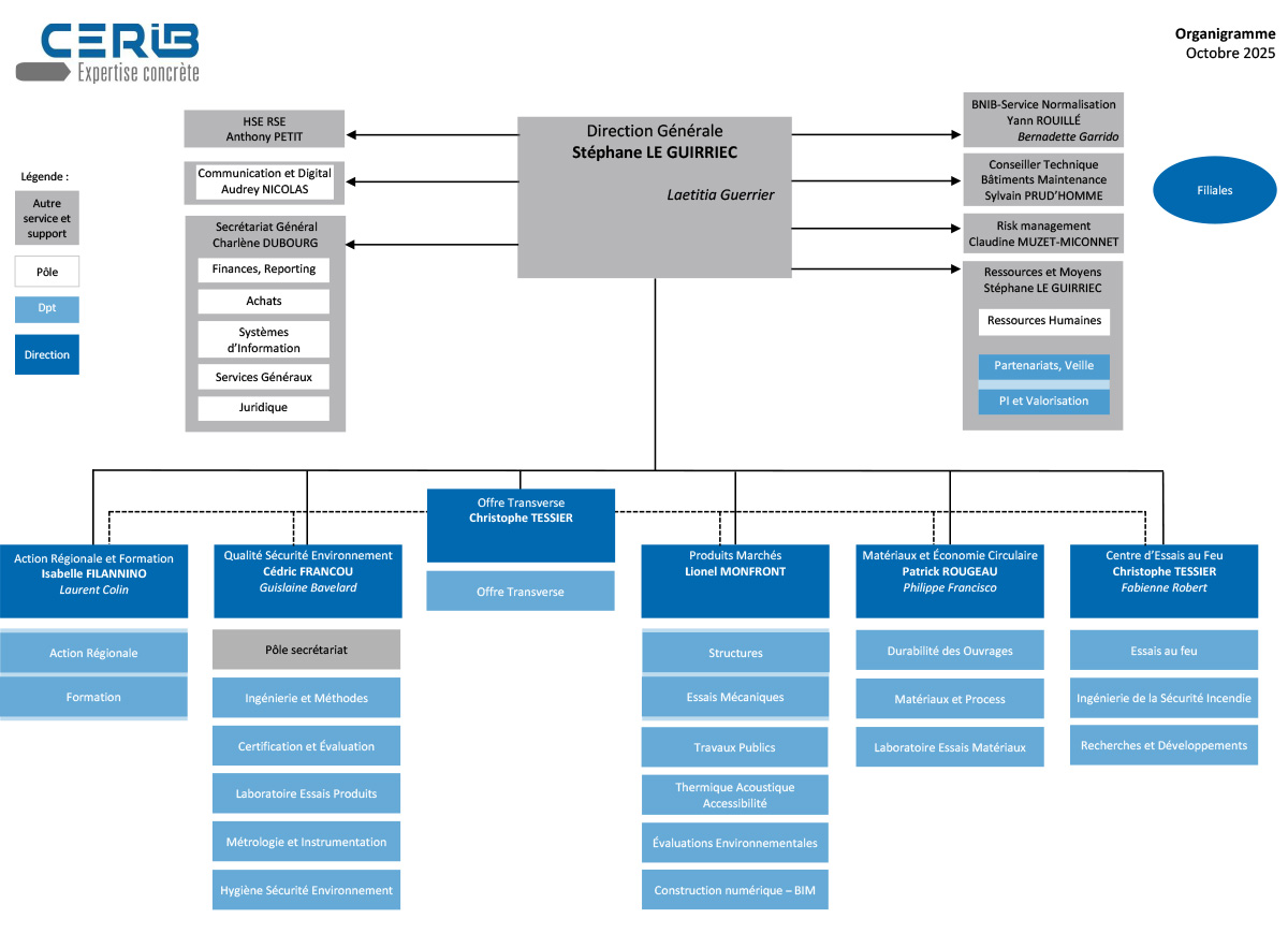 Afin de mieux répondre à ses missions, le Cerib a mis en place une organisation favorisant le maillage des compétences nécessaires, au travers de 6 Directions :